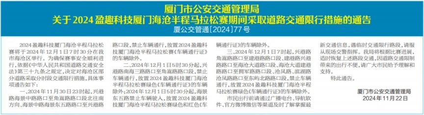 厦门市公安交通管理局关于2024盈趣科技厦门海沧半程马拉松赛期间采取道路交通限行措施的通告