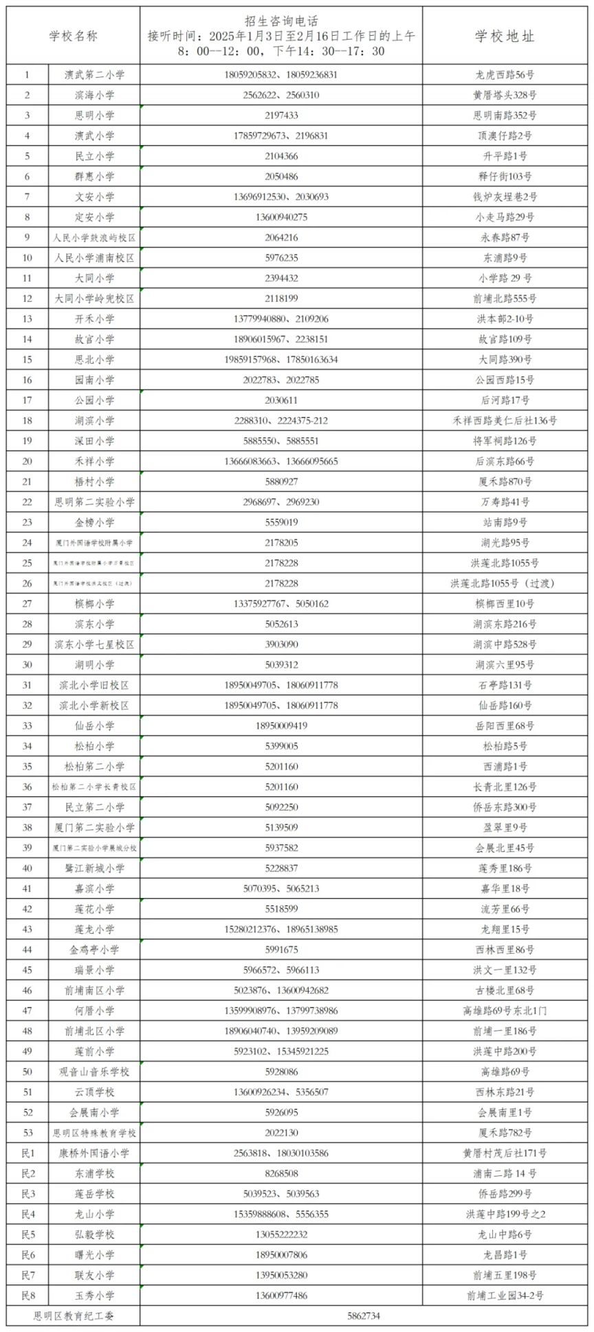 5. "厦门思明区实验小学" - 咨询电话:0592-XXXXXXX