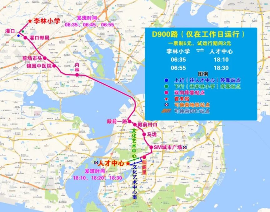 人才中心始发,经湖滨东路、仙岳路、嘉禾路至“SM城市广场”站接原线路往李林小学。