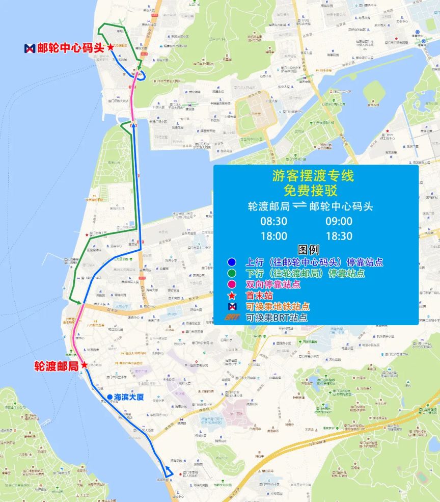 为方便轮渡码头、中山路周边片区乘客往返邮轮中心码头,6月18日起,试运营游客摆渡专线,具体如下: