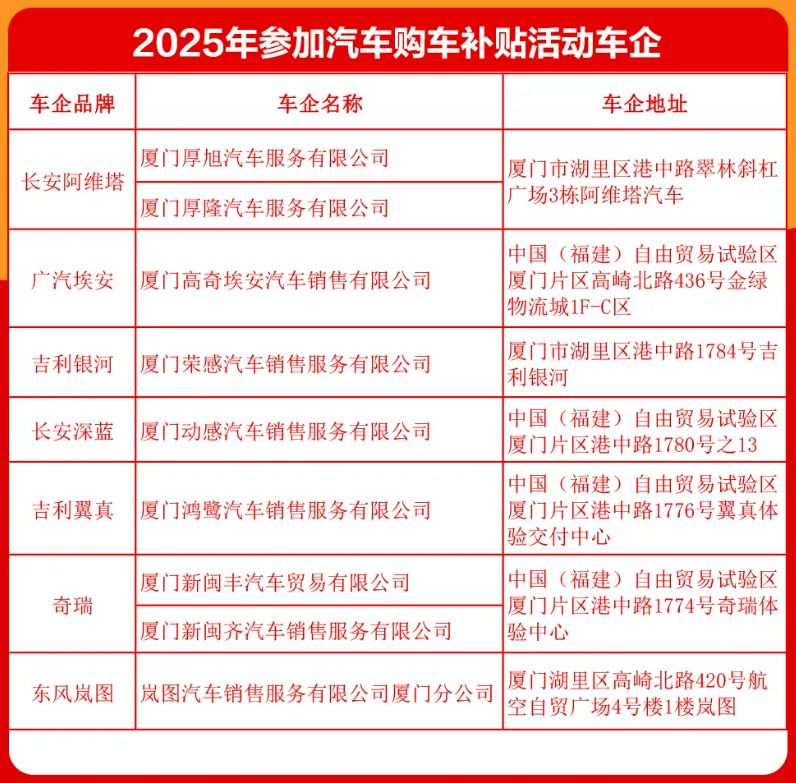【2025厦门自贸片区购车补贴大放送】 限时活动详情揭晓! 为响应国家绿色出行号召,助力市民购车需求,厦门自贸片区特别推出购车补贴活动。以下为活动详情: