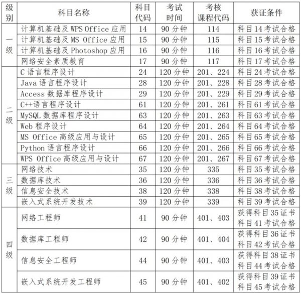 三、考试科目 本次考试科目包括:一级MS Office、一级WPS Office、二级MS Office高级应用、二级WPS Office高级应用、三级网络技术、三级数据库技术等。